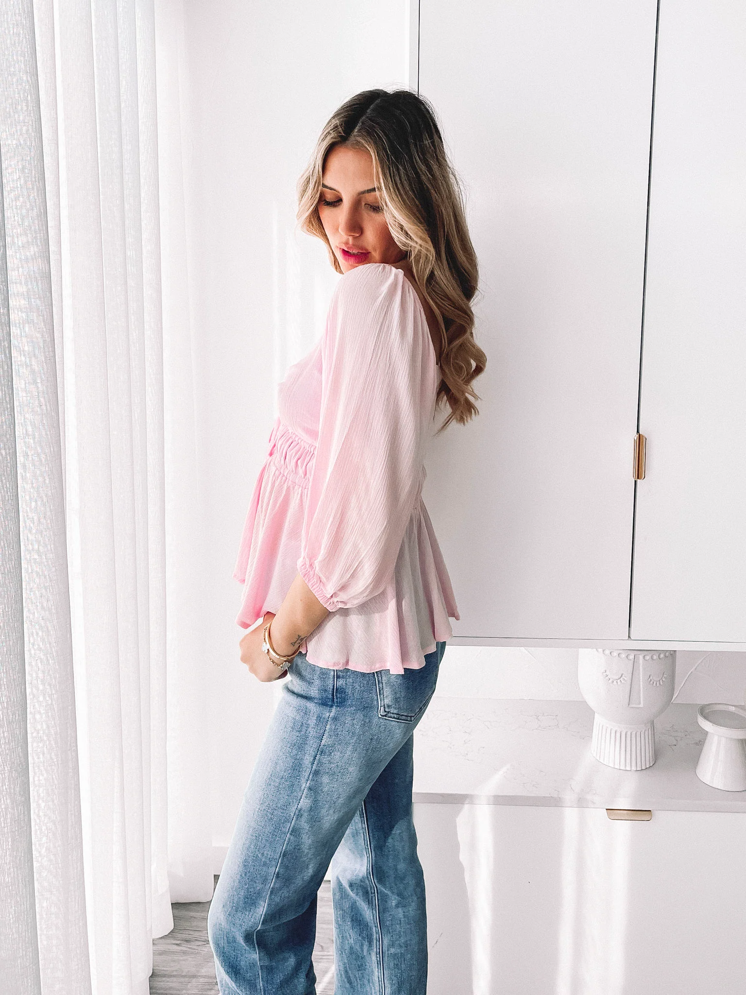 Our Caroll Top comes in a soft pink hue, perfect for showcasing your sweet, feminine style. Featuring a sweetheart neckline with a cutout and tie detail, short bubble sleeves, and a flowy peplum silhouette, it’s effortlessly charming. Complete the look with a floral headband for a playful touch.