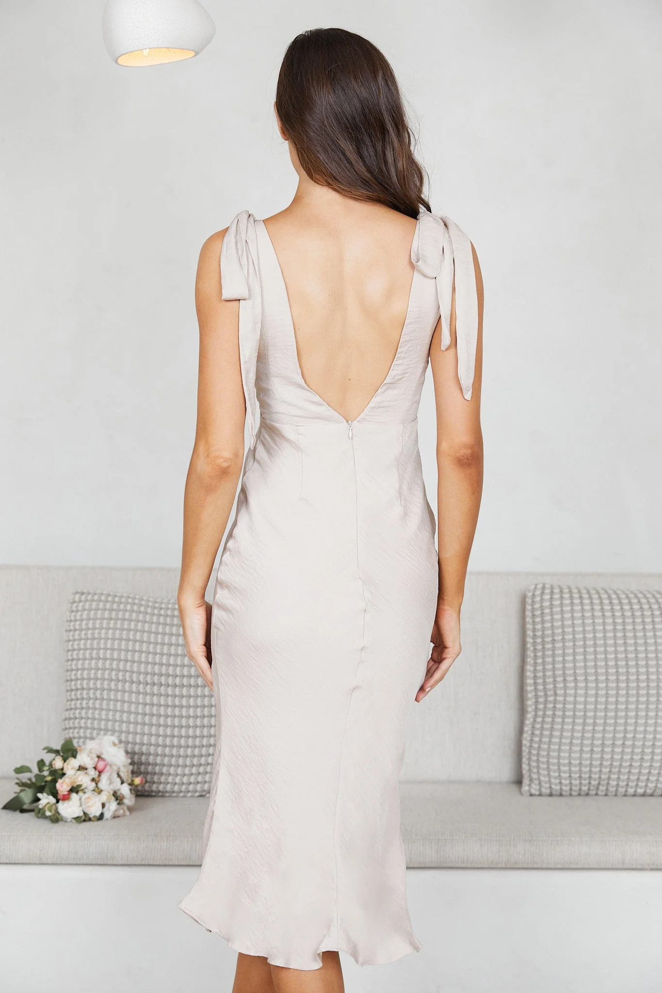 Our Eleanora Dress is a dream featuring in a champagne color. The tie shoulder straps and v neckline with tucked fabric under the bust are a flattering addition to this peice. Perfect for evening parties, work and business Casual! This feminine & whimsical number is practical & fun, making it the best of both worlds.