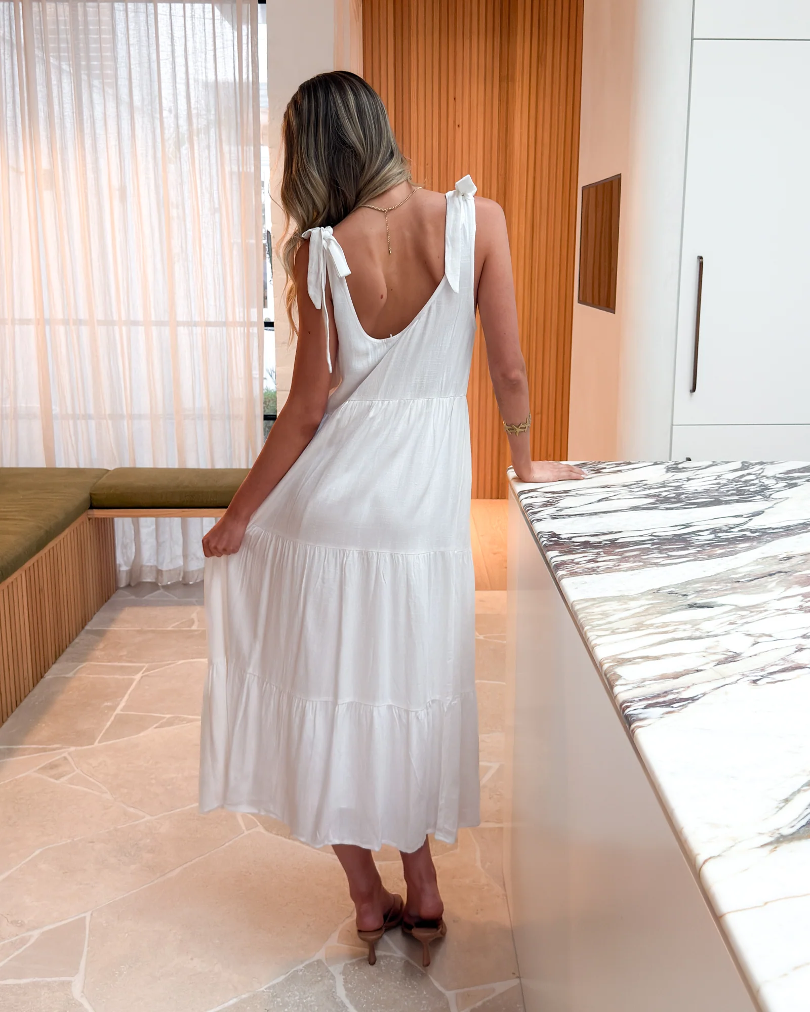 Our Lydia Dress comes in a classic fresh white tone. This relaxed midi features a scoop neckline, tie detailing on the shoulder straps, and tiered skirt with gathered detailing. Paired with a sunhat and tan sandals, this piece is perfect for a balmy day look!