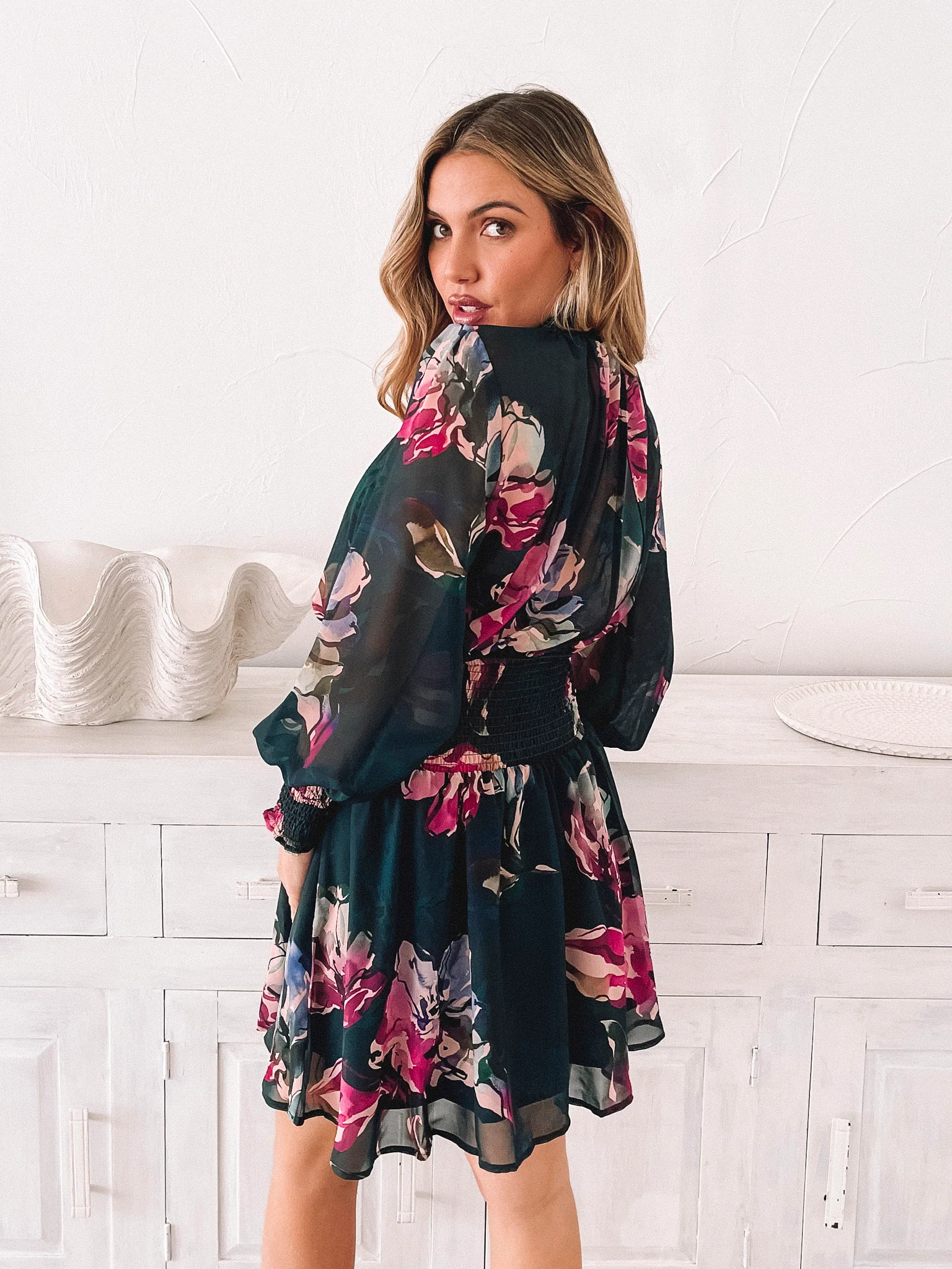 Our Neary Dress comes in an emerald floral print. Indulge in the ultimate fashion moment with this piece, featuring a high neckline, long sleeves with smocked cuffs, gathered detailing, and a mini length. Style it with platform heels and diamond accessories for an extra-chic look.