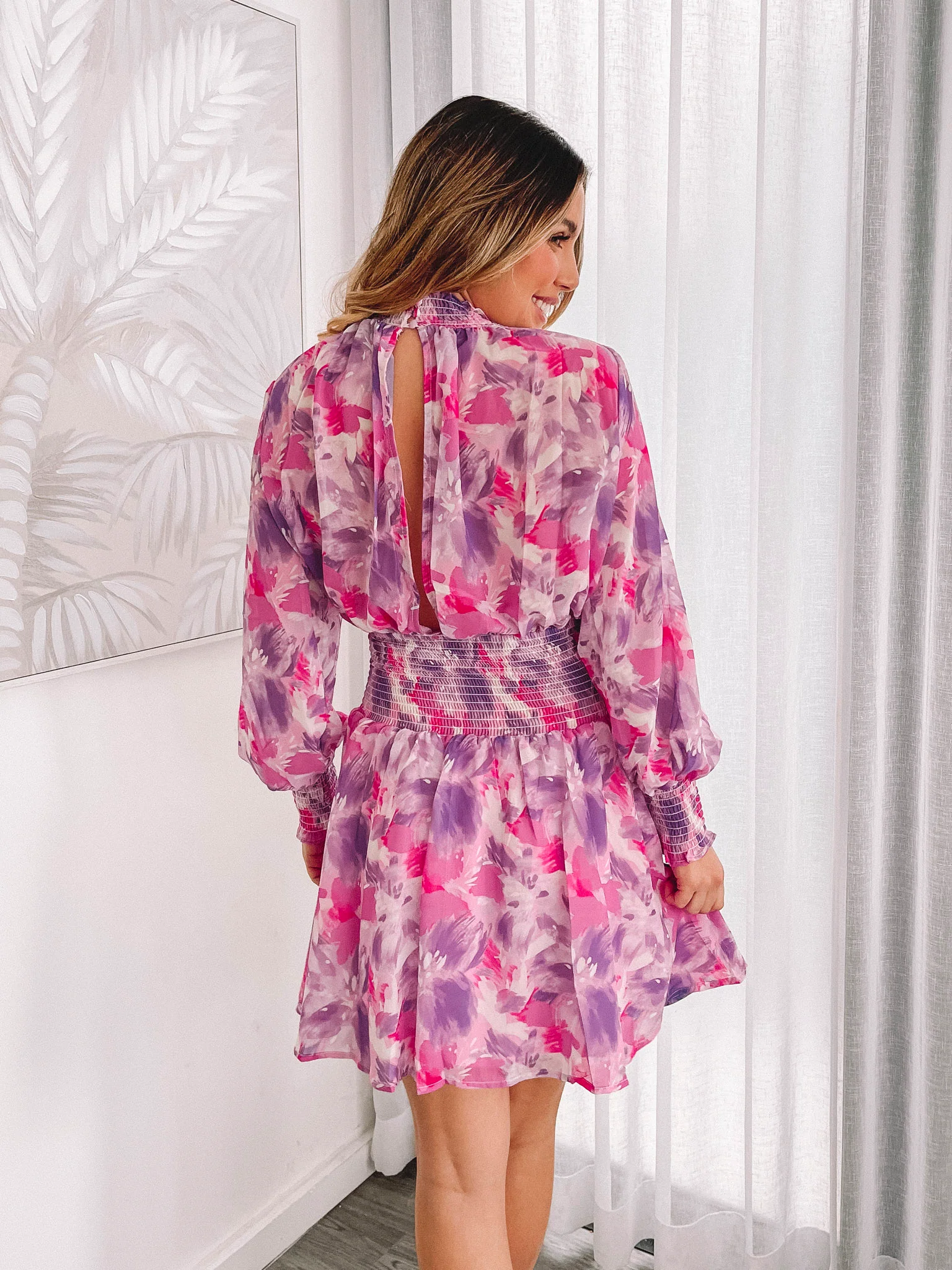Our Neary Dress comes in a mulberry blossom print. Indulge in the ultimate fashion moment with this piece, featuring a high neckline, long sleeves with smocked cuffs, gathered detailing, and a mini length. Style it with platform heels and diamond accessories for an extra-chic look.