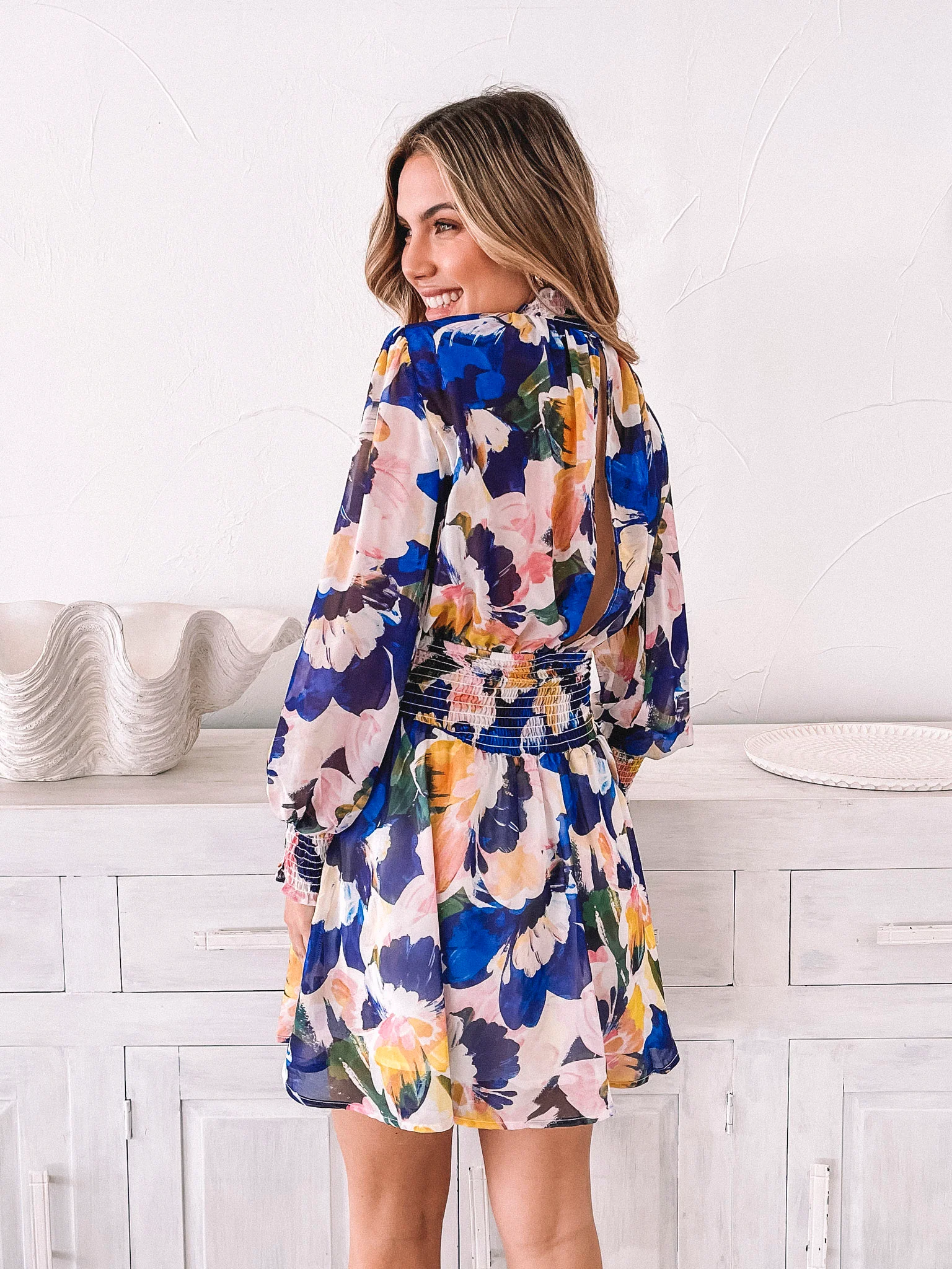 Our Neary Dress comes in a painted cobalt print. Indulge in the ultimate fashion moment with this piece, featuring a high neckline, long sleeves with smocked cuffs, gathered detailing, and a mini length. Style it with platform heels and diamond accessories for an extra-chic look.