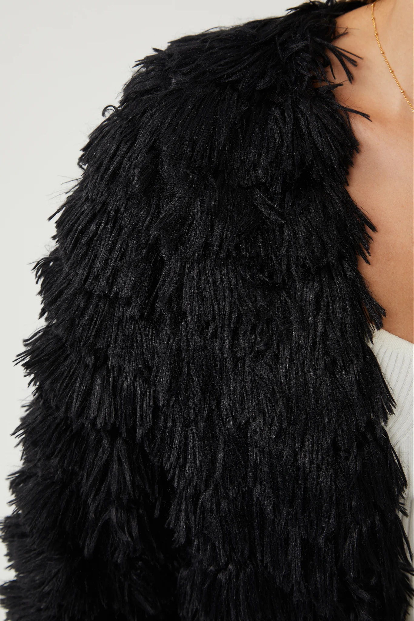 - Key Features: Long sleeves. Open front. Fluffy fabric. Easy wear. Fringe material. Lined. Soft feel. No pockets. Hidden clasp on the inside front.