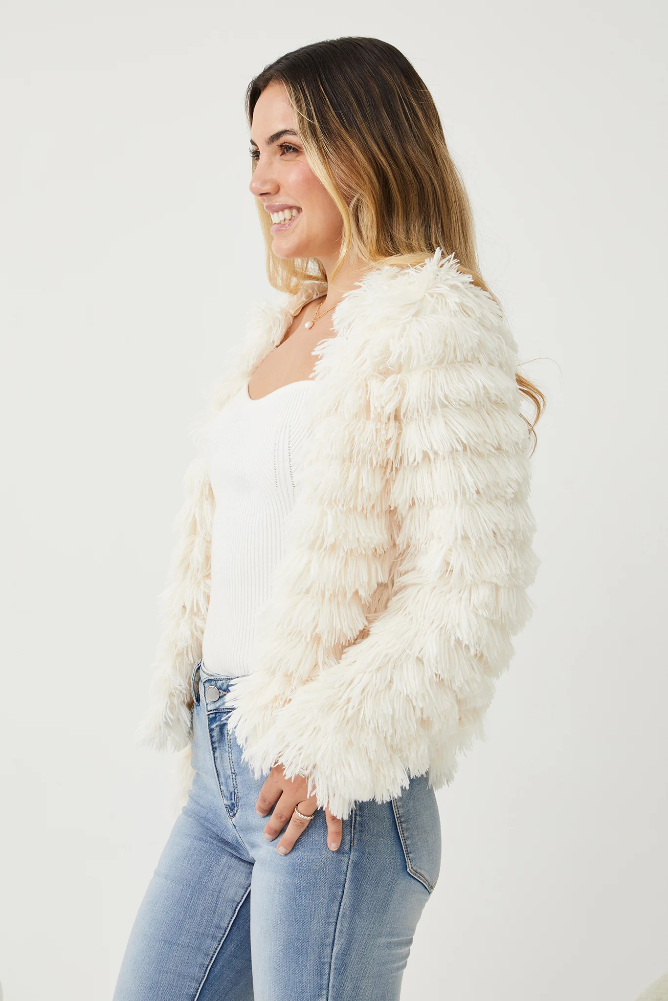 Our Ophelle Jacket comes in a fresh white colour. Embrace effortless style with this long-sleeve fluffy jacket, designed to deliver both comfort and statement appeal. Featuring an open front, it’s perfect for showcasing your favourite inner top while staying cosy.