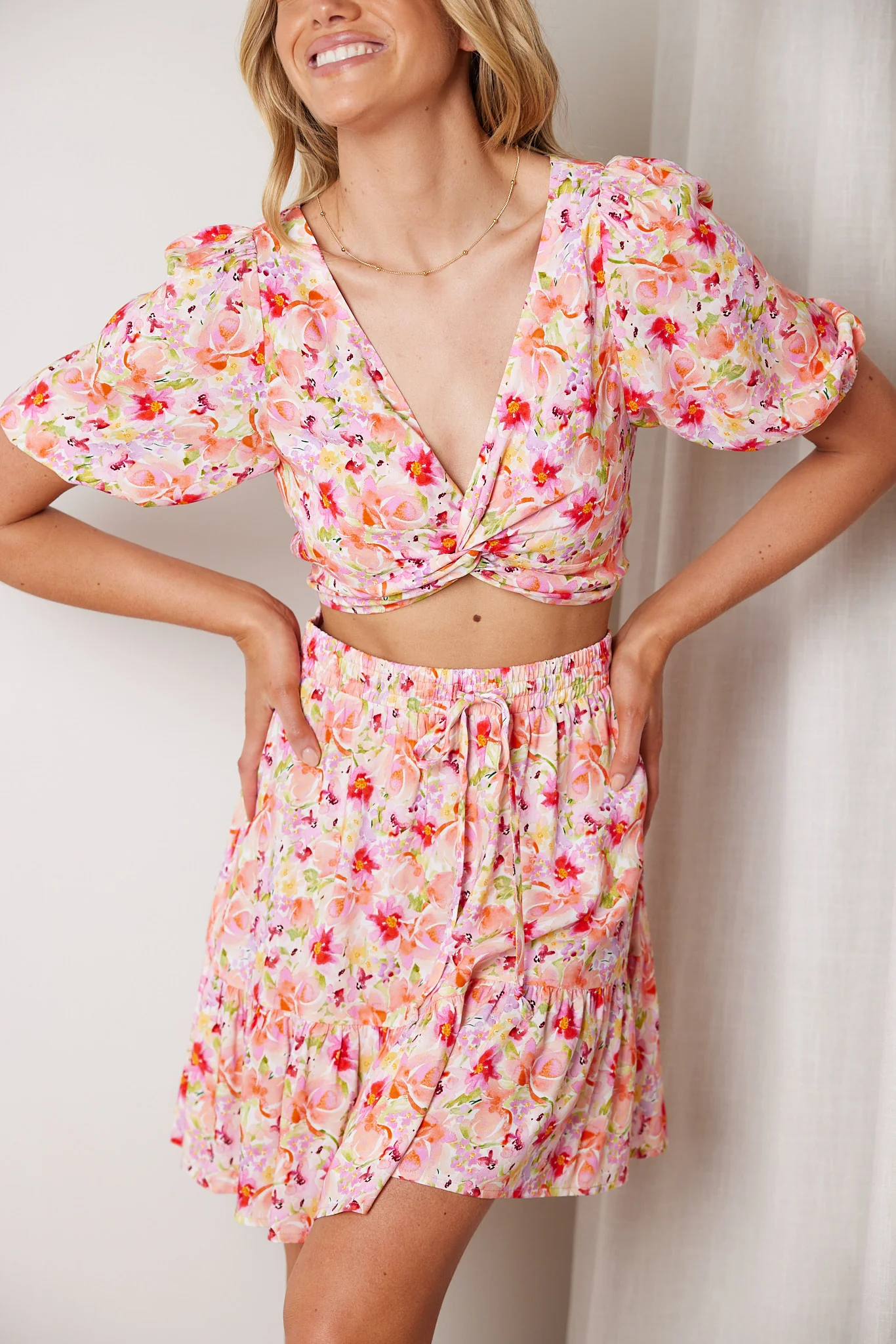Our Shani Top comes in a multicoloured print. Hue in abundance, this staple is designed with a low v-neckline, short puff sleeves, twist on waist and crop length. Complete the look with our Shani Skirt!
