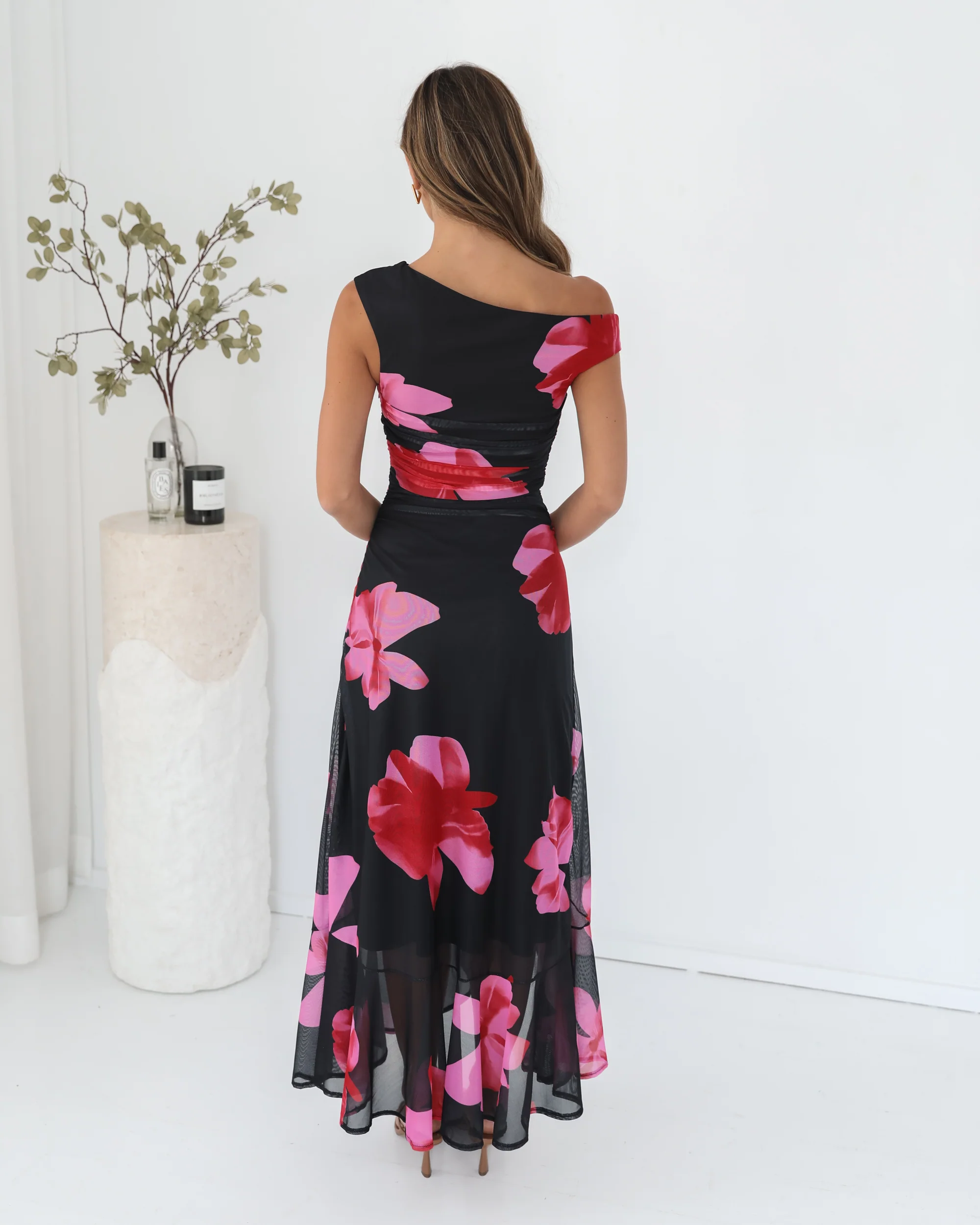 Our Tivara Dress comes in a black base with multicoloured floral prints. Make every step feel like a slow dance with this gorgeous piece that features an asymmetric neckline, ruching on bodice, ruffled skirt and maxi length hem. For a dreamy date night glow, style it with pearl accessories!